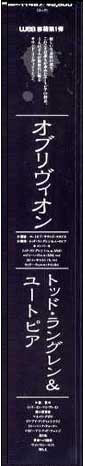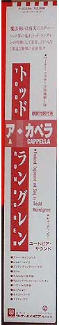 最後の段はすべて細めの帯です。POV,TRIVIAが日本発売されなかったので、最後のユートピアLPは「オブリヴィオン」。グループはインディーズのPASSPORT RECORDSに移りますが、日本での発売権は再びワーナーに戻りました。しかしこれもあまり日本盤は売れなかったと思います。「アカペラ」はワーナーから。ソロ名義はアメリカでもBEARSVILLEではなくWarner Brosでした。日本でのトッドのLPはアカペラが最後。このあと「ニアリーヒューマン」からは日本ではCDのみの発売となりました。(アメリカではLP発売あり) 次の「カシム」のソロはアメリカ原盤がEMI AMERICAなので東芝から。プライスーサルトンはCBSソニーから発売されました。