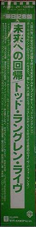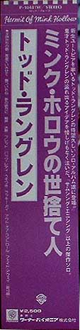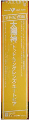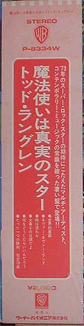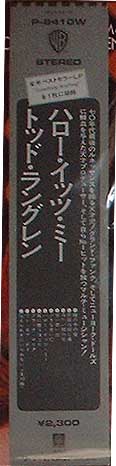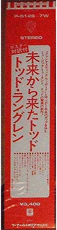 上の3つは初期のワーナーパイオニアから出た3枚のLPの帯です。日本で一番最初に出たトッドのLPは「魔法使いは真実のスター」で、1973年6月25日発売と推測され、当初2000円の価格表示があります。変形ジャケではありませんが、バンドエイド、はがきが付属していました。その後、おそらくセールス好調に気を良くした日本ワーナーが、当時日本未発売SOMETHING/ANYTHING?をダイジェストして一枚にした凝縮盤「ハロー・イッツ・ミー」をリリース。(1974年) この時が2300円だったようです。ジャケットも日本独自、米TV番組"MIDNIGHT SPECIAL"でHELLO IT'S ME"をピアノで弾く写真からとられています。海外ではプレミアものでした。 「未来から来たトッド」は2枚組で3400円。米盤と同じフォーマットで見開きなしで2枚組、ポスター付き仕様でした。デビューシングル「瞳の中の愛」は日本語表記が「トッド・ルングレン」でしたがLPが発売される73年頃にはラングレンとなっていたようです。
