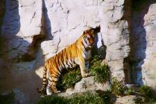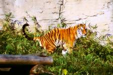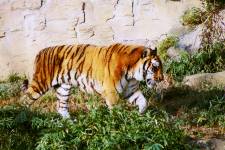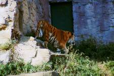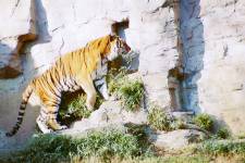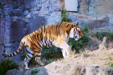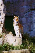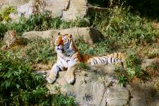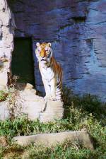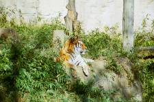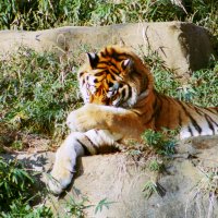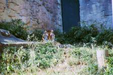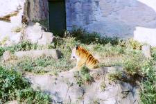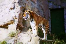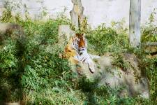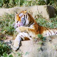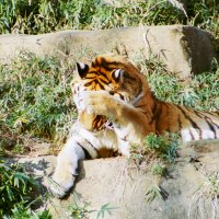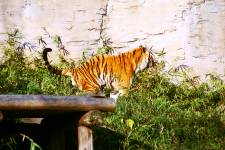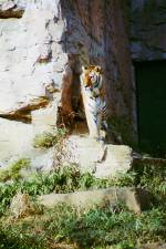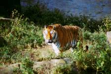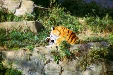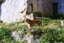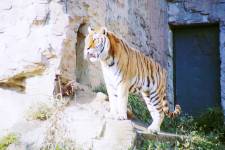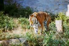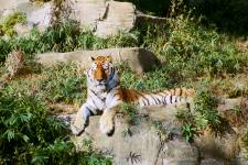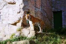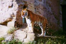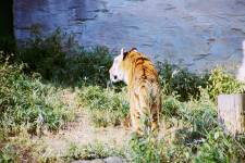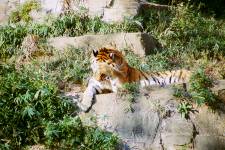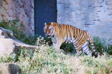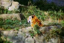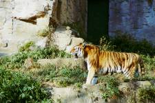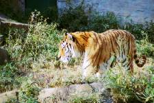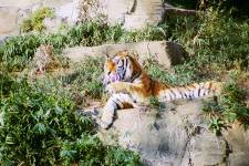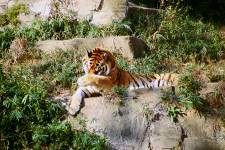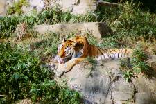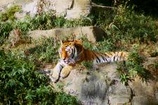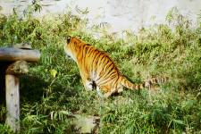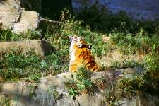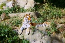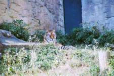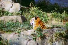 さて、現地に着いてみると、広いスペースに虎が一頭しかいませんでした。アムールトラのオスの(何才だか忘れましたが)アレックス君です。 多摩動物公園のトラはアムールトラとスマトラトラが一つがいずついるらしいのですが、この日はアムールトラのオス一頭しか表に出ていませんでした。 ちょっと寂しいですが、ネコ科らしく面白い動きをしてくれることを期待してしばらく粘ってみます。