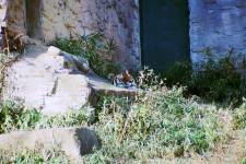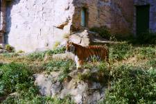 ちょうど昼過ぎだったせいか、彼は岩を枕にしての昼寝の最中でした。しかたがないので、その辺を闊歩している孔雀に気を散らしたりして時間をつぶしながら彼が起きるのを待ちます。 うしろで工事用車両らしい車の走る大きな音がするとむっくりと起き上がって手前へ出てきました……