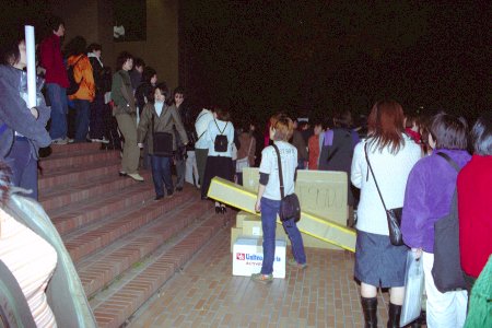 会場の正面階段で機材・備品の運搬をやっている。(JPEG, 34949bytes)