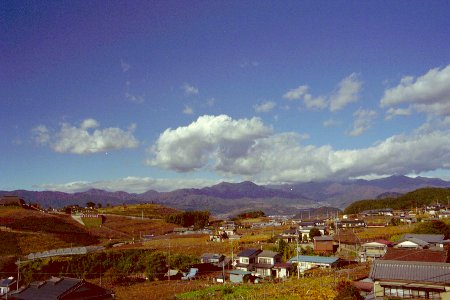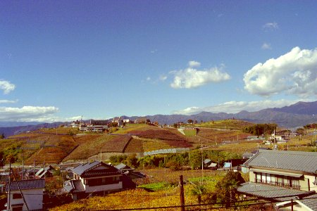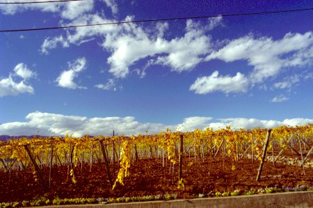 青い空、白い雲、黄色の葡萄畑の対比が美しい。(JPEG, 41465bytes)