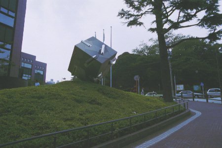 - 立方体のオブジェの向こうが野毛山公園。 (JPEG, 28232bytes)