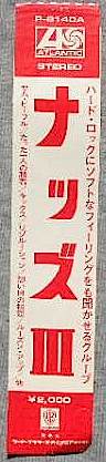 上3枚はナッズのLPの帯。2枚は日本グラモフォンから出たものです。帯には「アトランティックレコーズ」のクレジットがあります。ナッズ・スリーはワーナーになってから。3枚とも帯はかなりレアです。3枚ともアトランティックのマークがあります。25年で2度か3度見ただけです。某オークションでは帯付き日本盤は10万円の値がつくこともありました。写真がぼけぼけなのは自分で所有していないのでweb上のJPEGから。