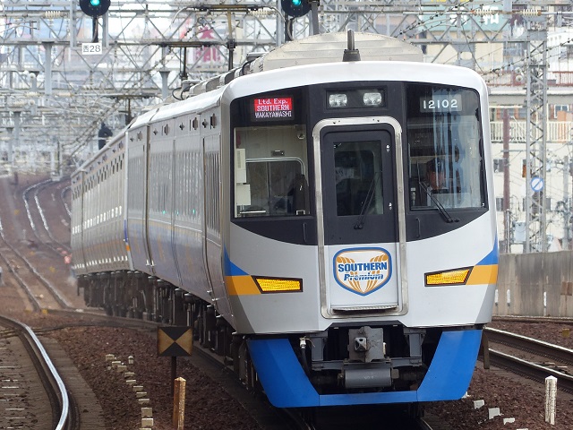 特急「サザン」で使用する特急車両です。愛称は「サザン・プレミアム」が付けられました。 編成は下記の通りです。 ←難波方 モハ12001形(Mc1)-サハ12801形(T1)-サハ12851形(T2)-モハ12101形(Mc2) 8000系、8300系、9000系の4両固定編成と連結し、特急「サザン」の指定席車両として運用されています。 2.車体構造 車体は軽量ステンレス車体となっています。 車体長は20mとなっています。 扉は片側に片開き引き戸が1か所設けられています。 先頭形状は、貫通扉が設けられました。貫通扉上にへっとライトが2灯設けられています。運転席、助手席下にテールライト兼標識灯が設けられています。助手席上に種別行先表示器が設けられました。運転席上に車両番号が設けられています。 車体帯は波を表すブルーとオレンジのラインとなっています。 3.車内設備 座席は2+2の回転リクライニングシートが採用されました。背面にテーブルとフットレスト、サービスコンセントが設けられています。 シートピッチは1,010mmとなっています。 全車両にプラズマクラスター発生器が設けられています。 仕切り壁上部にはLEDの案内表示器が設けられています。 デッキには防犯カメラが設けられています。 1号車(モハ12101)にはトイレ(車いす対応大型トイレ、男性小便器、女性専用洋式トイレ)、洗面所が設けられました。 4号車(モハ12001)には多目的室が設けられ、座席のほか非常通報装置や鏡が備えられています。普段は施錠されていますが、おむつ交換などの時に乗務員に申し出れば使用することができます。その他飲料の自動販売機が設けられています。 4.機器類 制御方式はIGBT-VVVFインバーター制御となっています。 主電動機は、180kWの三相かご形誘導電動機のMB-5091-A2となっています。 駆動装置は、WNドライブとなっています。 ブレーキ装置は、回生ブレーキ併用全電気指令式空気ブレーキ(全電気ブレーキ付き)が採用されました。 台車は、モノリンク式ボルスタレス台車のSS177M(電動車)、SS177T(附随車)が用されました。 5.主な履歴 2011年(平成23年)9月1日に運用開始されました。 |