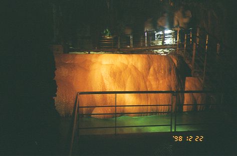 黄金の盃・・この鍾乳石はリムストーン(かぼちゃ石)と呼ばれ高さ2.5m ・外周31mもありこの種の鍾乳石では、日本で最大級です。ここより流れ出 る泉は(幸福の泉)と呼ばれ、青緑色の神秘的な物です