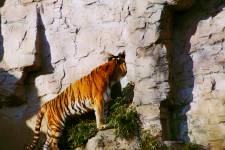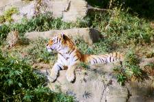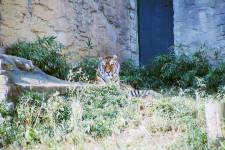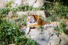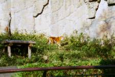 さて、現地に着いてみると、広いスペースに虎が一頭しかいませんでした。アムールトラのオスの(何才だか忘れましたが)アレックス君です。 多摩動物公園のトラはアムールトラとスマトラトラが一つがいずついるらしいのですが、この日はアムールトラのオス一頭しか表に出ていませんでした。 ちょっと寂しいですが、ネコ科らしく面白い動きをしてくれることを期待してしばらく粘ってみます。